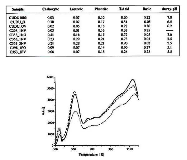 圖1顯示了過氧化氫處理后產(chǎn)生的活性炭的化學(xué)行為。從上面看出的氧化過程增加了活性炭的總酸度,并且與羧基和酚類基團(tuán)的增加一致。此外,TPD曲線顯示了放出氣體的增量,峰值集中在與活性炭相同的溫度。低溫和高溫分解組的面積總體增加歸因于羧基-內(nèi)酯類結(jié)構(gòu)和后面的酚類基團(tuán)。H2O2氧化碳的FT-IR光譜在1542和1190cm-1處顯示帶就像那些原始的碳,但后來的孔隙已經(jīng)擴(kuò)大,顯示出C-O伸展模式的增加。總之,這些研究表明僅在H的性質(zhì)的小變化H2O2處理過的碳,即,是在氧化時(shí),其類似于由其他研究人員報(bào)告的行為沒有觀察到變化顯著。其中過氧化氫溶液的氧化作用明顯地看作羧酸類基團(tuán)的重要減少,伴隨著堿性基團(tuán)的大量增加。